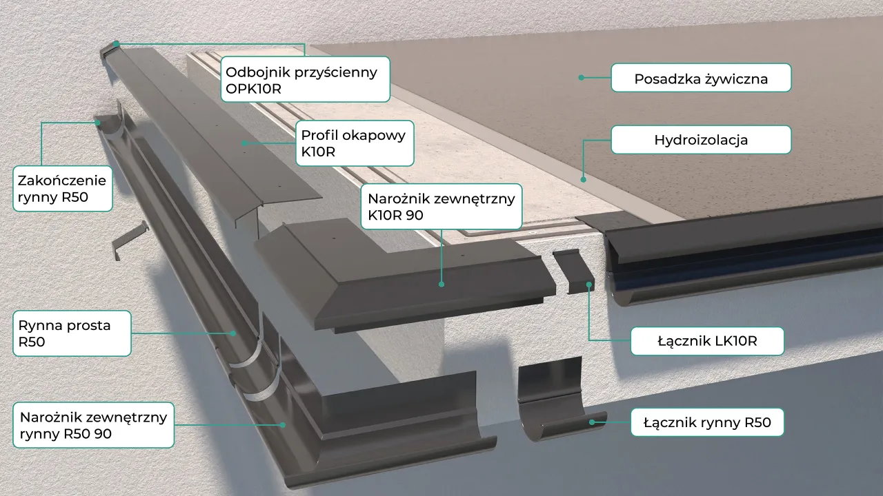 System do wykonania tarasów i balkonów z posadzką z żywic cienkowarstwowych charakteryzujący się zastosowaniem profili okapowych K10R. Profil K10R przystosowany jest do montażu aluminiowej rynny R50. W skład systemu wchodzą profile okapowe K10R z elementami uzupełniającymi jak narożniki zewnętrzne i wewnętrzne K10R 90 i K10R 135 o kątach 90º i 135º, łączniki LK10R i odbojniki przyścienne OPK10R. Wykonanie tarasu lub balkonu w technologii cienkowarstwowej posadzki żywicznej z wykończeniem strefy okapowej profilem K10R zapewnia skuteczne odprowadzenie wody opadowej z powierzchni posadzki za pośrednictwem systemowej rynny R50 z kolankami i rurą spustową, trwałość i odporność antykorozyjną profili, kompletność systemowego rozwiązania oraz estetyczny wygląd.