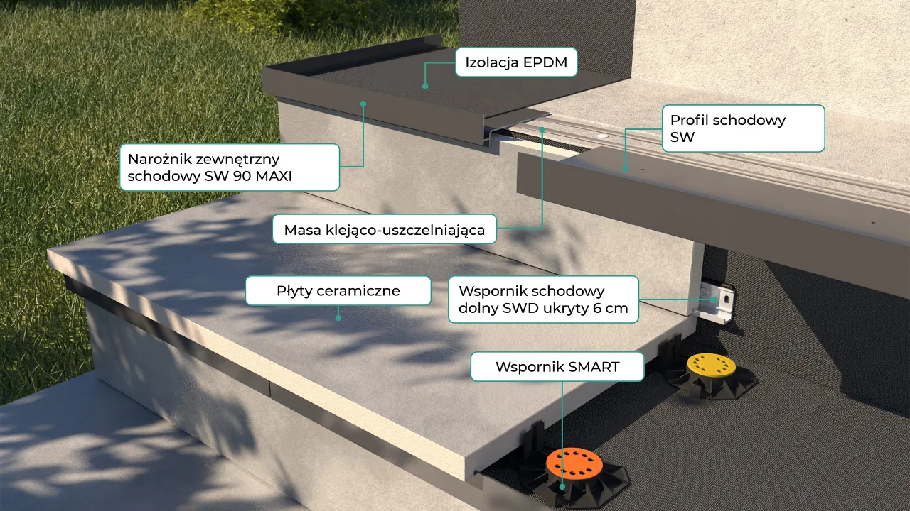 System do wykonania okładziny schodów zewnętrznych w technologii wentylowanej. Składnikami systemu schodowego SW są profile SW z elementami uzupełniającymi jak narożniki zewnętrzny schodowy SW90 MAXI, wsporniki schodowe dolne SWD lub wsporniki schodowe dolne SWD ukryte, wsporniki schodowe górne SWG, wsporniki tarasowe SMART, membrana EPDM z narożnikami wewnętrznymi i zewnętrznymi, klejem i uszczelniaczem oraz taśmą samoprzylepną. Istotną cechą systemu jest możliwość wykonania schodów zewnętrznych o dowolnej bryle konstrukcji w oparciu o okładzinę z płyt ceramicznych o grubości 2 cm. System schodowy SW to jedyne kompletne rozwiązanie wykonania schodów z okładziną wentylowaną.