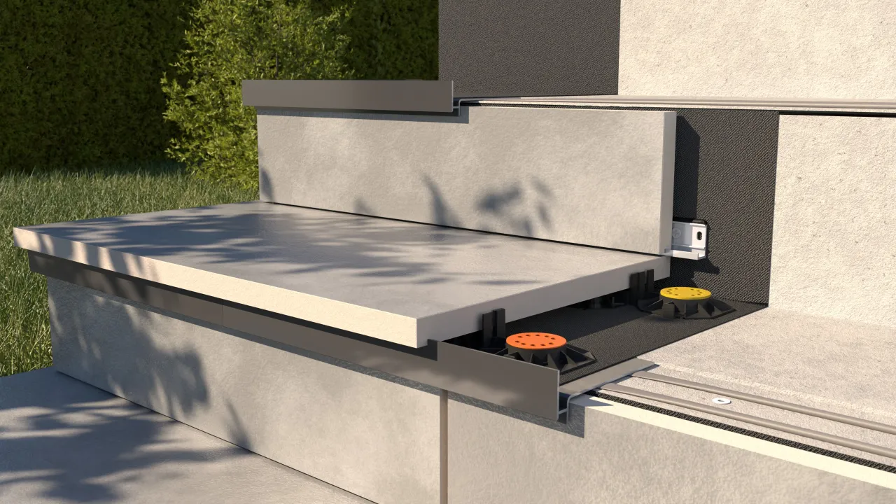 system do wykonywania schodów zewnętrznych z okładziną wentylowaną z płyt ceramicznych o grubości 2 cm na wspornikach o stałej wysokości SMART
