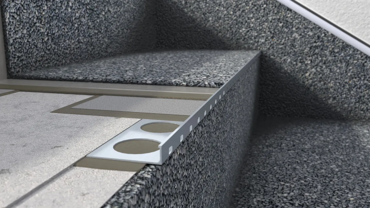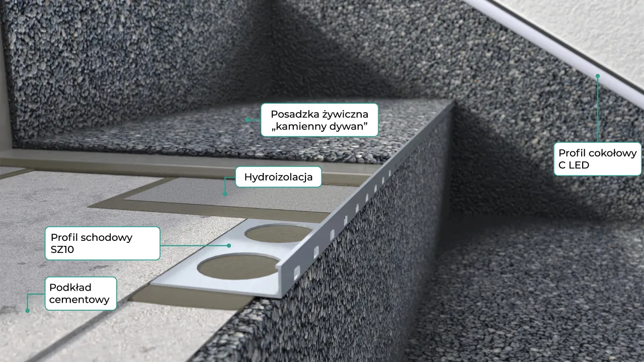 systemowe profile wykańczające krawędzie stopnic, podstopnic i policzków w technologii okładziny żywicznej kamienny dywan