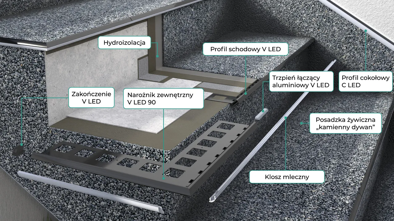 Zastosowanie profili schodowych V LED umożliwia wykończenie krawędzi schodów wykonywanych z okładziną żywiczną w technologii kamienny dywan w przypadku konieczności zapewnienia wysokiej wytrzymałości wykańczanych krawędzi z zachowaniem ich estetycznego wyglądu. Profile V LED umożliwiają montaż taśmy LED. W skład systemu wchodzą profile V LED z elementami uzupełniającymi jak narożnik zewnętrzny V LED 90 o kącie 90º, trzpień łączący aluminiowy V LED oraz zakończenia V LED.