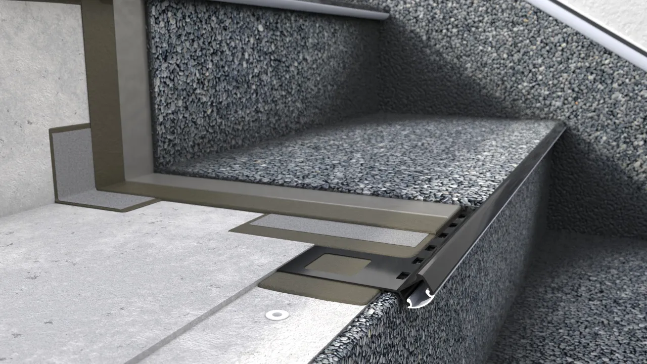 systemowe profile wykańczające krawędzie stopnic i policzków w technologii okładziny żywicznej kamienny dywan