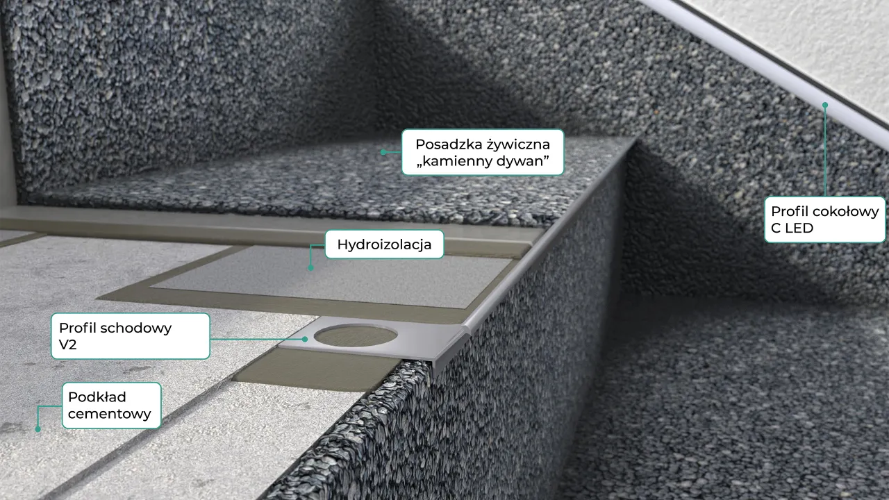 Zastosowanie profili schodowych V2 umożliwia wykończenie krawędzi schodów wykonywanych z okładziną żywiczną w technologii kamienny dywan w przypadku konieczności zapewnienia wysokiej wytrzymałości wykańczanych krawędzi z zachowaniem ich estetycznego wyglądu.