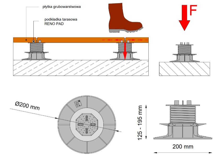 Mając powyższe na uwadze możemy sprawdzić czy płyta EPS lub XPS o grubości 10 cm odkształciła by się i o jaką wartość gdyby ułożyć na niej podstawkę i obciążyć siłą statyczną zgodnie z Tabelą 4 (przy założeniu linowej zależności wielkość odkształcenia od siły). Nieznaczne odkształciła by się jedynie płyt XPS 500 – jest to odpowiednio 0,8 mm przy podstawce RENOPAD i obciążeniu 120 kg lub 2,5 mm przy maksymalnych 400 kg.