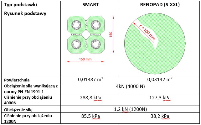 Żeby określić jakie ciśnienie będzie wywierać 1 sztuka podstawki na podłoże należy znać wartość siły, która będzie oddziaływać na podstawki. W tabeli 3 przyjęto dwie wartości sił 4 kN - maksymalne obciążenie przypadające na 1 m2 balkonu wynikające z wytycznych normy 1991-1, oraz 1,2 kN obciążenie masą 120 kg zgodnie z Tabelą 3.