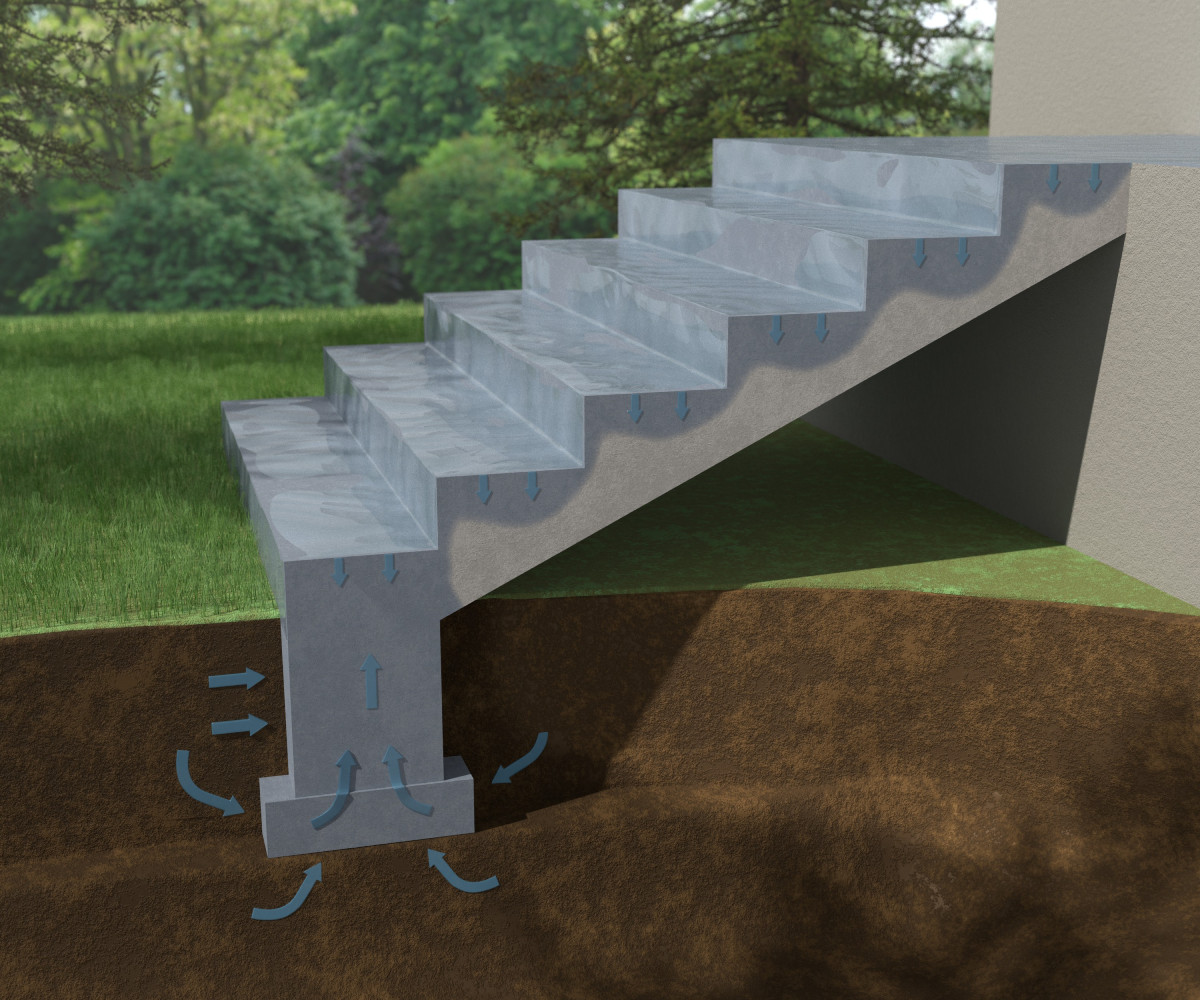 Szczelne zabezpieczenie powierzchni schodów z góry przy braku izolacji pionowej oraz poziomej na części fundamentowej nie odcina dopływu wilgoci z gruntu i o ile beton bez warstw wierzchnich mógł swobodnie wysychać, o tyle po przykryciu płytkami i hydroizolacjami już nie. W wyniku podciągania kapilarnego wody z gruntu, a bez możliwości jej odparowania, zawartość wody w betonie rośnie z czasem, co przy wielu cyklach przejścia przez temperaturę 0 °C w okresie zimowym jest częstym powodem usterek rys. 3.