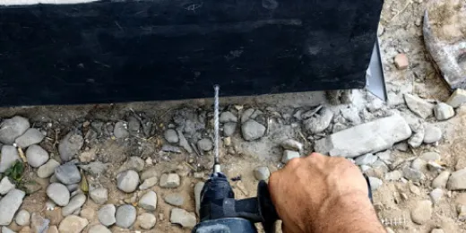 Na policzku schodów zamontowano wspornik schodowy dolny w postaci listwy o długości 200 cm odpowiednio dociętej fot. 17. Listwa mocowana jest do podłoża zarówno mechanicznie za pomocą kołków montażowych 40x8 mm, jak i klejowo – klej montażowy fot. 18-20. Na listwie znajdują się prefabrykowane otwory montażowe, lecz jeśli istnieje taka potrzeba wynikająca np. z konieczności docinania i dopasowywania się do kształtu schodów, otwory wiercimy samodzielnie. Przed naniesieniem kleju montażowego zarówno podłoże, jak i listwę należy oczyścić oraz odtłuścić. Listwa pełni rolę wspornika dla pionowo układanej płytki o grubości 20 mm. W przypadku tej inwestycji również policzek schodów został obłożony płytą gresową o grubości 20 mm układaną bezklejowo w wsporniku dolnym, aby umożliwić odpływ wody w wsporniku przewiercono otwory przelotowe w rozstawie osiowym co 50 cm.