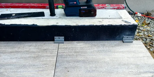 Po zdjęciu profila SW i narożnika NZ SW/90, w uskoku naniesiono cienką warstwę zaprawy uszczelniającej. Docięte płyty ułożono w pozycji pionowej w profilu wspornika dolnego podstopnicy fot. 24. W pierwszej kolejności zamocowano narożnik zewnętrzny NZ SW/90, a potem docięty profil prosty SW fot. 24. Profile SW oraz narożniki nie wymagają łączników, w miejscach połączeń pozostawiamy szczeliny dylatacyjne o szerokości 2 mm i wypełniamy je masą uszczelniającą np. poliuretanową.
