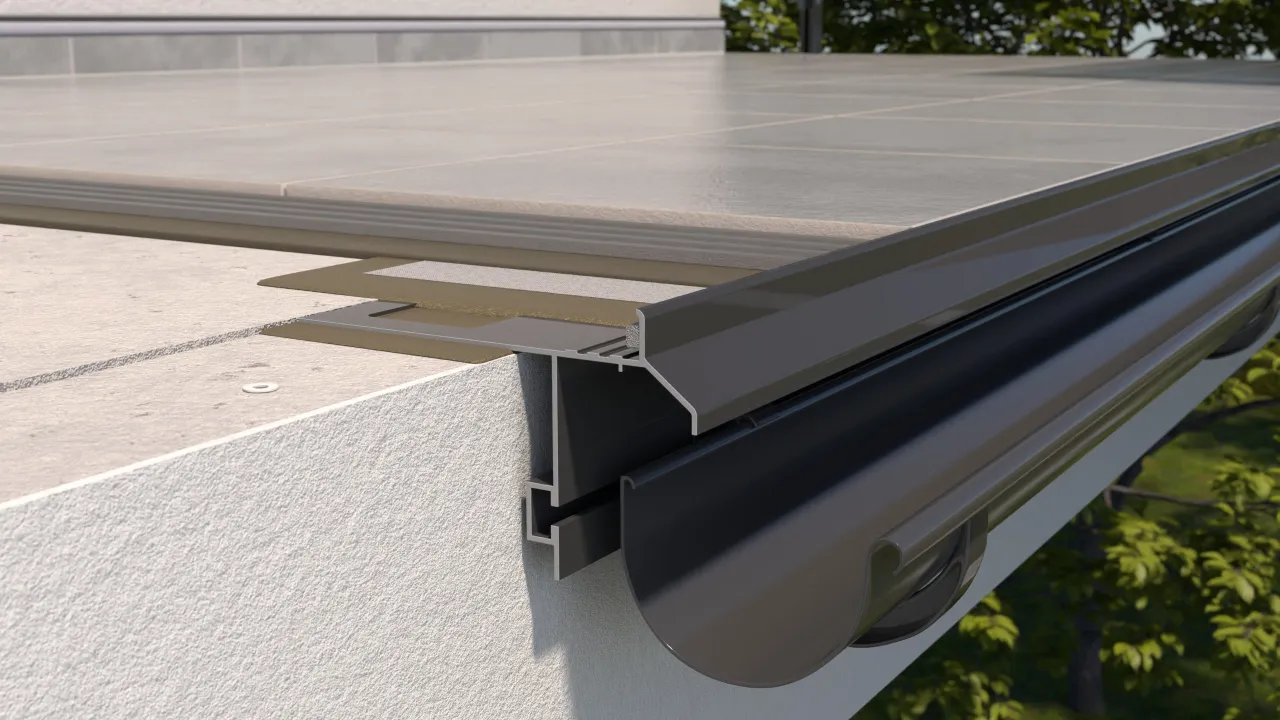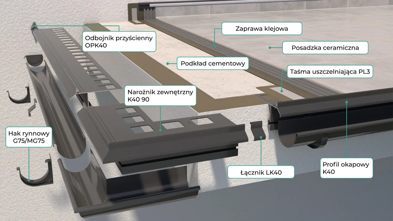 System do wykonania tarasów i balkonów z posadzką z płytek ceramicznych układanych na mineralnej zaprawie klejowej z uszczelnieniem podpłytkowym z zaprawy uszczelniającej, charakteryzujący się zastosowaniem masywnych profili okapowych K40 z szerokim oparciem na podkładzie cementowym. Ich budowa zapewnia pełną szczelność pomiędzy profilem okapowym a posadzką z jednoczesnym odprowadzeniem wilgoci z warstw podposadzkowych. Budowa profilu K40 umożliwia montaż rynien PVC Gamrat, Bryza lub Marley o średnicy 75 mm za pośrednictwem haków rynnowych G75 lub MG75. Ponadto profil K40 posiada wklejony fabrycznie sznur dylatacyjny stanowiący podparcie dla uszczelnienia dylatacji pomiędzy profilem a posadzką oraz ochrony otworów odwadniających przed ich zasłonięciem zaprawą klejową w trakcie wykonywania prac. W skład systemu wchodzą profile okapowe K40 z elementami uzupełniającymi jak narożniki zewnętrzne i wewnętrzne K40 90 i K40 135 o kątach 90º i 135º, łączniki LK40 i odbojniki przyścienne OPK40, taśma uszczelniająca PL3, taśma progowa. Wykonanie tarasu lub balkonu w technologii klejonych płytek ceramicznych z wykończeniem strefy okapowej profilem K40 zapewnia skuteczne odprowadzenie wody opadowej z powierzchni posadzki, pełną szczelność konstrukcji, trwałość i odporność antykorozyjną profili, kompletność systemowego rozwiązania oraz estetyczny wygląd.