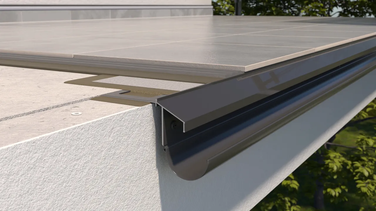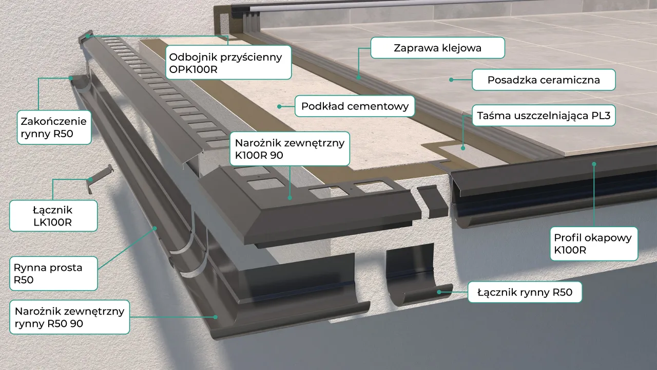System do wykonania tarasów i balkonów z posadzką z płytek ceramicznych układanych na mineralnej zaprawie klejowej z uszczelnieniem podpłytkowym z zaprawy uszczelniającej, charakteryzujący się zastosowaniem prostych i ekonomicznych profili okapowych K100R z możliwością montażu aluminiowej rynny R50. W skład systemu wchodzą profile okapowe K100R z elementami uzupełniającymi jak narożniki zewnętrzne i wewnętrzne K100R 90 i K100R 135 o kątach 90º i 135º, łączniki LK100R i odbojniki przyścienne OPK100R, taśma uszczelniajaca PL3, taśma progowa. Wykonanie tarasu lub balkonu w technologii klejonych płytek ceramicznych z wykończeniem strefy okapowej profilem K100R zapewnia skuteczne odprowadzenie wody opadowej z powierzchni posadzki za pośrednictwem systemowej rynny R50 z kolankami i rurą spustową, trwałość i odporność antykorozyjną profili, kompletność systemowego rozwiązania oraz estetyczny wygląd.