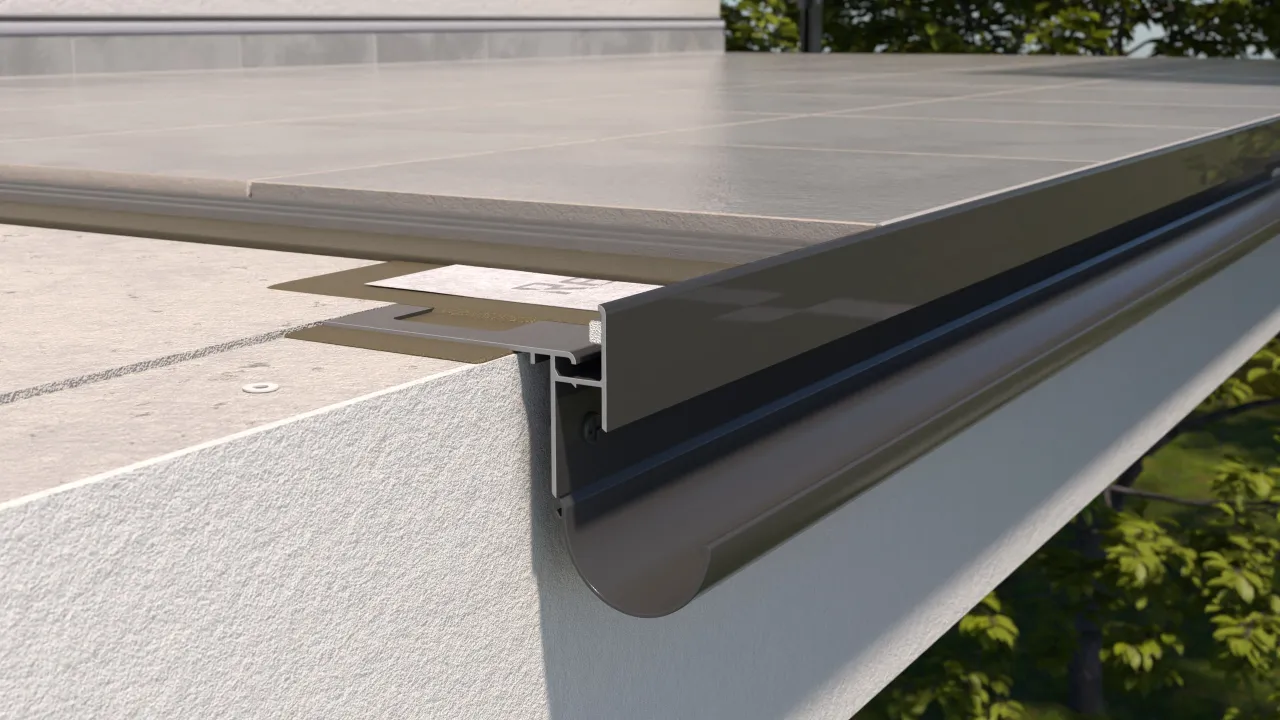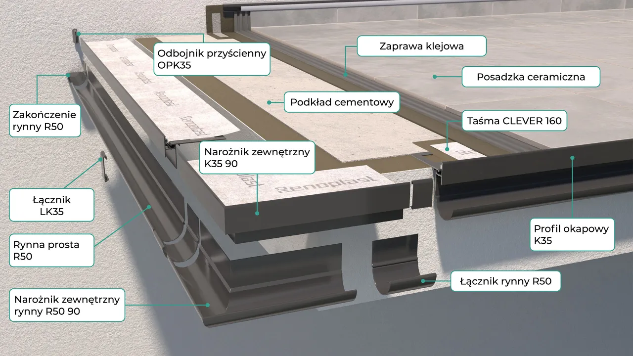 Najbardziej uniwersalny system do wykonania tarasów i balkonów z posadzką z płytek ceramicznych układanych na mineralnej zaprawie klejowej z uszczelnieniem podpłytkowym z zaprawy uszczelniającej. System charakteryzujący się zastosowaniem profili okapowych K35 których budowa zapewnia pełną szczelność pomiędzy profilem okapowym a posadzką z jednoczesnym odprowadzeniem wilgoci z warstw podposadzkowych. Konstrukcja profilu K35 umożliwia montaż aluminiowych rynien R50 z kolankami i rurami spustowymi. Ponadto profil K35 posiada szczelinę umożliwiającą zastosowanie taśmy uszczelniającej CLEVER oraz wklejony fabrycznie sznur dylatacyjny stanowiący podparcie dla uszczelnienia dylatacji pomiędzy profilem a posadzką oraz chroniący otwory odwadniające przed zasłonięciem zaprawą klejową w trakcie wykonywania prac. Profil K35 występuje w wersji umożliwiającej zastosowanie na balkonach i tarasach z krawędzią w kształcie luku. W skład systemu wchodzą profile okapowe K35 z elementami uzupełniającymi jak narożniki zewnętrzne i wewnętrzne K35 90 i K35 135 o kątach 90º i 135º, łączniki LK35 i odbojniki przyścienne OPK35, taśma uszczelniajaca CLEVER, taśma progowa. Elementami opcjonalnymi są profile boczne K35B, narożnik zewnętrzny łączący K35/K35B 90º, łączniki LK35 oraz odbojniki przyścienne OPK35. Wykonanie tarasu lub balkonu w technologii klejonych płytek ceramicznych z wykończeniem strefy okapowej profilem K35 zapewnia skuteczne odprowadzenie wody opadowej z powierzchni posadzki, pełną szczelność konstrukcji, trwałość i odporność antykorozyjną profili, kompletność systemowego rozwiązania oraz estetyczny wygląd.