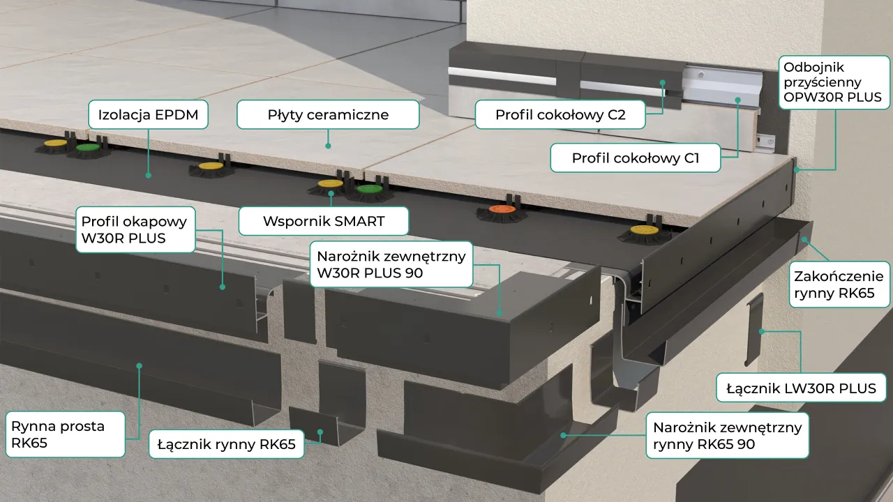 System do wykonywania balkonów i tarasów z posadzką wentylowaną z płyt ceramicznych układanych na wspornikach tarasowych o stałej wysokości SMART lub wspornikach regulowanych RENOPAD PRO 13-18 mm równolegle do warstwy podkładu (ze spadkiem) z możliwością zamontowania systemowej aluminiowej rynny R50 lub RK65. W skład systemu BASIC W30 PLUS wchodzą profile okapowe W30 PLUS z elementami uzupełniającymi jak narożniki zewnętrzne i wewnętrzne W30R PLUS 90 i W30R 135 Plus o kątach 90º i 135º, łączniki LW30R PLUS i odbojniki przyścienne OPW30R, rynny aluminiowe R50 lub RK65 z kolankami i rurą spustową, wsporniki do płyt posadzkowych SMART lub RENOPAD PRO 13-18 mm, membrana EPDM z narożnikam wewnętrznymi i zewnętrznymi, klejem i uszczelniaczem, taśmą samoprzylepną. Istotne cechy systemu to kompletność umożliwiająca wykonanie posadzki tarasu i balkonu bez konieczności dorabiania dodatkowych elementów. Unikalna budowa profili okapowych W30R PLUS dzięki umieszczonym od czoła profilu otworom odwadniającym umożliwia skuteczne odwodnienie powierzchni tarasu lub balkonu, również w warunkach niedrożności głównych otworów odwadniających. Sztywna budowa profili okapowych W30R PLUS zapewnia pewne oparcie dla posadzki z płyt ceramicznych uniemożliwiając ich przesuwanie, do jakiego dochodzi w okresie zimowym. Wsporniki SMART to stabilne i trwałe podparcie dla płyt posadzkowych z możliwością niwelacji nierówności podłoża za pomocą nakładek dystansowych. Opcjonalnie można stosować wspornik regulowany RENOPAD PRO 13-18 mm. Izolację z membrany EPDM cechuje wysoka trwałość oraz odporność na oddziaływanie czynników atmosferycznych i chemicznych. Prostota systemu BASIC W30 PLUS umożliwia wykonanie prac montażowych przez osoby nieposiadające specjalistycznej wiedzy technicznej.