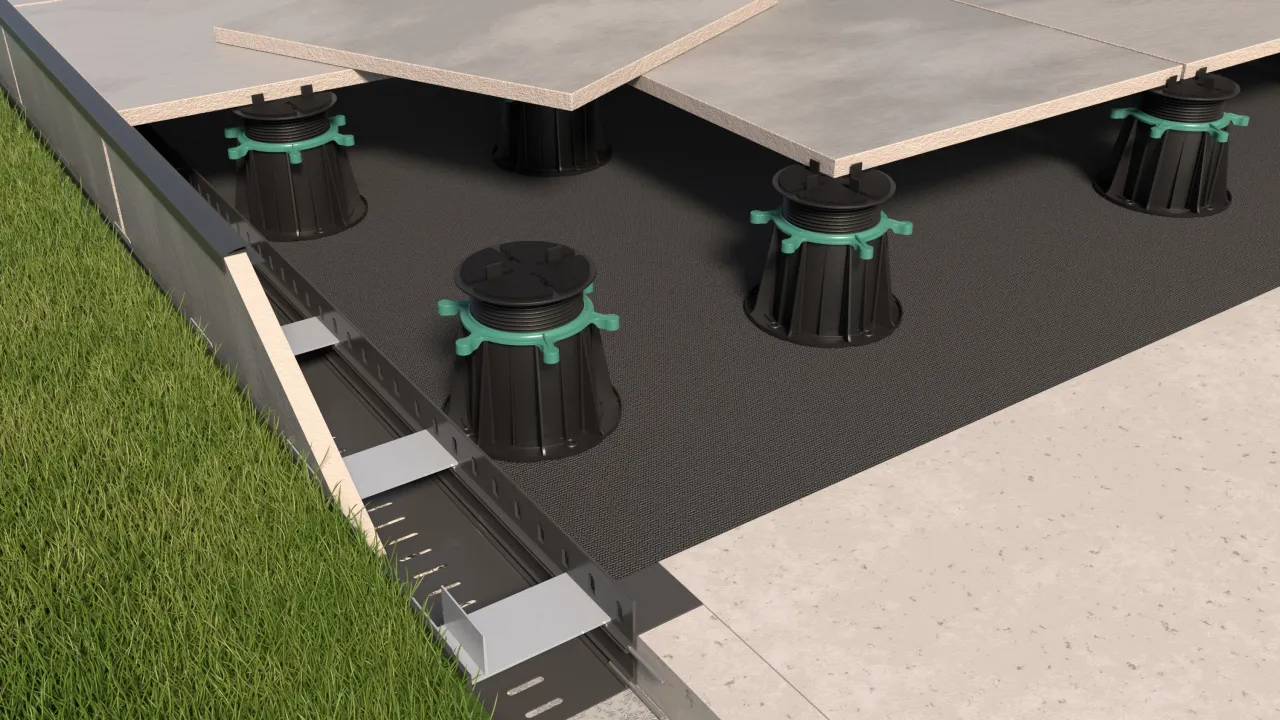 system umożliwiający wykonanie tarasów zewnętrznych z korytem RENODRAIN z posadzką z płyt ceramicznych o grubości 2 cm na wspornikach regulowanych RENOPAD PRO w płaszczyźnie podniesionej w stosunku do otaczającego terenu.