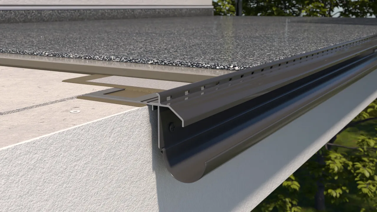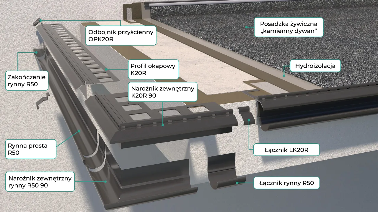 System do wykonania tarasów i balkonów z posadzką z żywic w technologii kamienny dywan charakteryzujący się zastosowaniem profili okapowych K20R. W skład systemu wchodzą profile okapowe K20R z elementami uzupełniającymi jak narożniki zewnętrzne i wewnętrzne K20R 90 i K20R 135 o kątach 90º i 135º, łączniki LK20R i odbojniki przyścienne OPK20R. Wykonanie tarasu lub balkonu w technologii kamienny dywan z wykończeniem strefy okapowej profilem K20R zapewnia skuteczne odprowadzenie wody opadowej z powierzchni posadzki balkonu za pośrednictwem systemowej rynny R50 z kolankami i rurą spustową, trwałość i odporność antykorozyjną profili, kompletność systemowego rozwiązania oraz estetyczny wygląd.